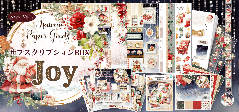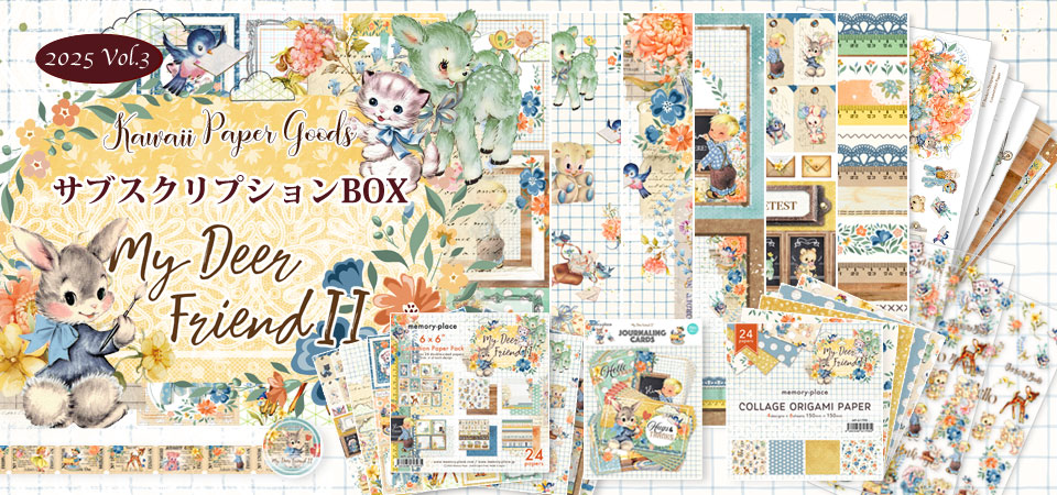 メモリープレイスのKawaii Paper Goods サブスクリプションボックスは、12x12ペーパー、6x6ペーパー、ジャーナルカード、マスキングテープなど、オリジナルの可愛いペーバーグッズ(Kawaii Paper Goods)が入ったセットが年3回送料無料でご自宅に届くサービスです。デザインがコーディネートされているので、どなたでも簡単に可愛い12インチレイアウト、カード、ミニブック作りを楽しめます。